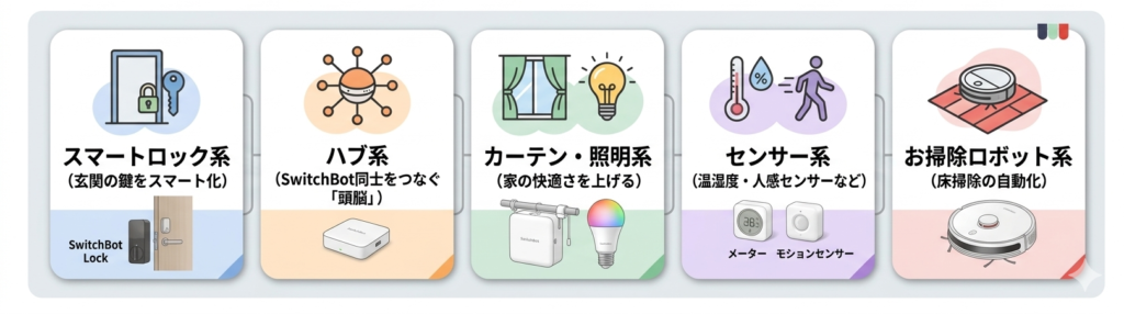 SwitchBotの製品は大きく以下のカテゴリに分かれています。