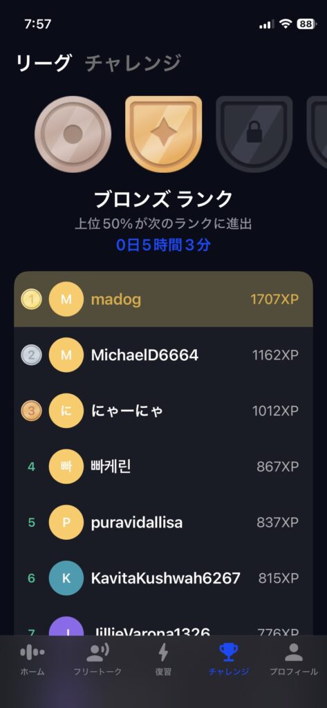 Speakには、学習量に応じて順位が決まる「リーグ機能」があります。