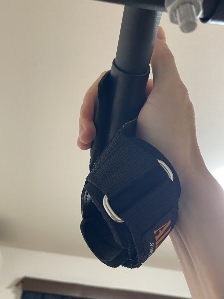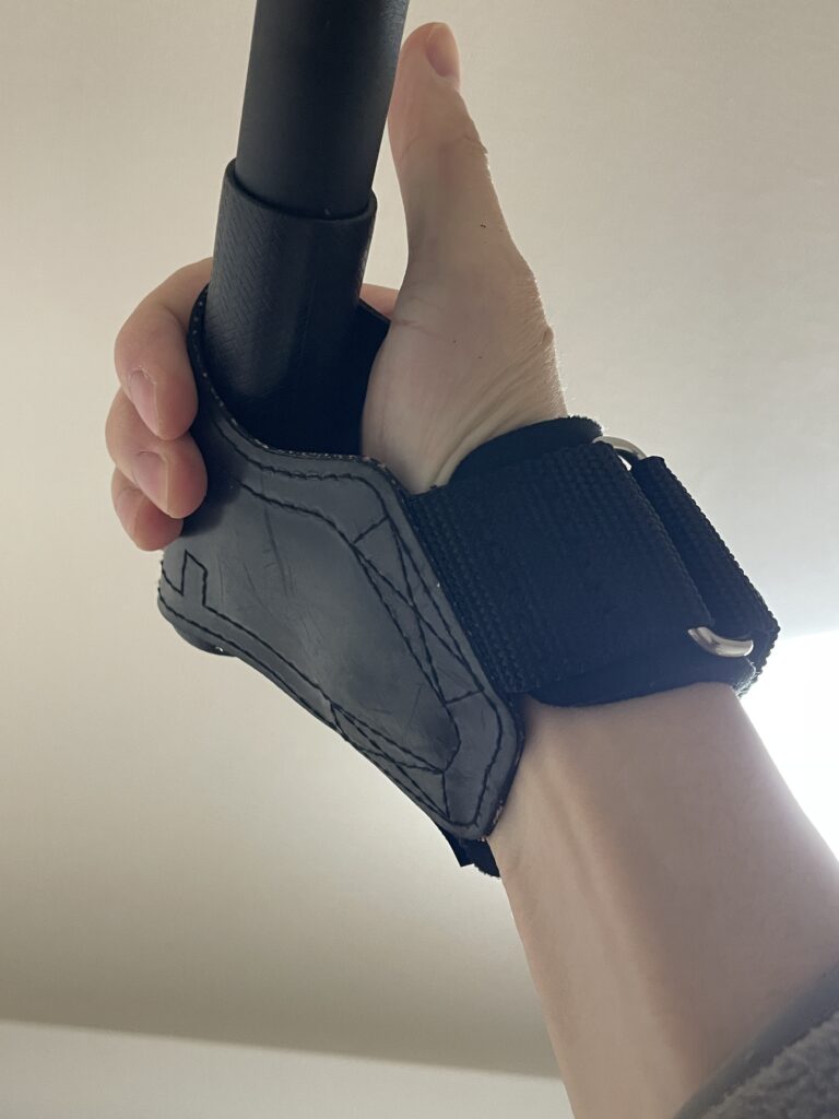 本来は手首のベルクロをしっかり締めて使いますが、私は「手首に巻かず、グリップ部分(ベロ)だけをバーに引っ掛けて」使用することもあります。