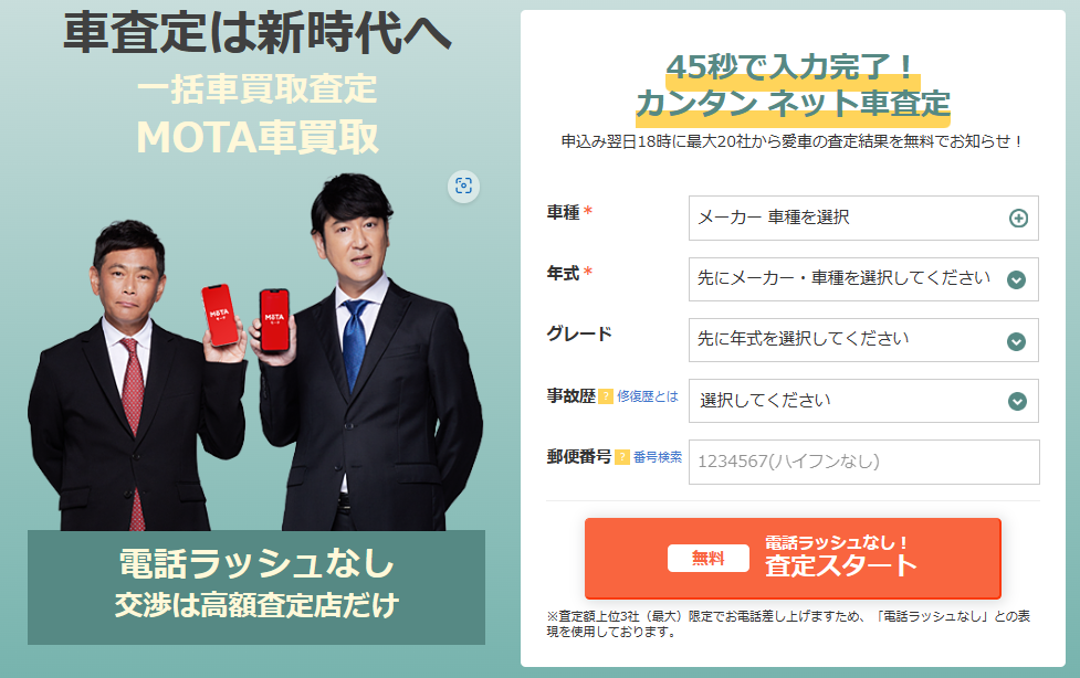 MOTAとは、「電話ラッシュのない車買取」のキャッチコピーで話題の車の一括査定サービスのひとつです。通常の一括査定サービスとは異なり、高額査定をした上位3社のみからしか電話がこないという電話ラッシュのないことが特徴です。