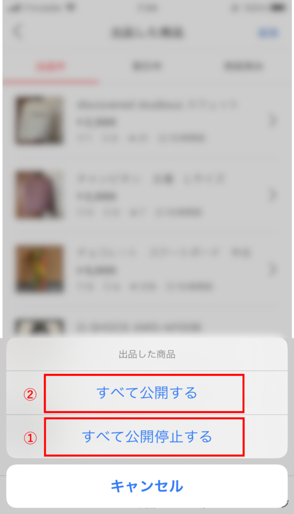 ③すると、下からポップアップが出てきますので、すべて公開停止する→すべて公開する、とします。