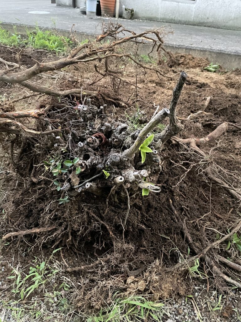 先ほどワイヤースリングがかけれず、ブロックチェーンで抜くことを諦めていた根っこですが、剣先スコップを使用することでものの数分で抜根することができました!
