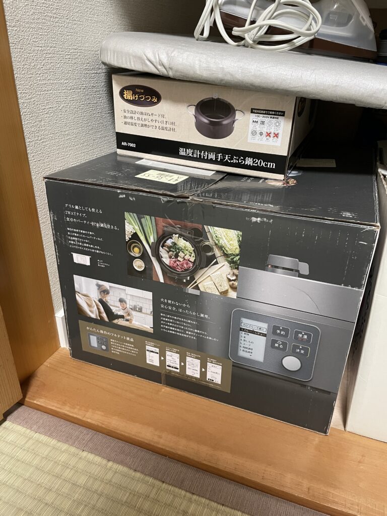 - 使ってない家電やストックが箱のまま積み上げられている