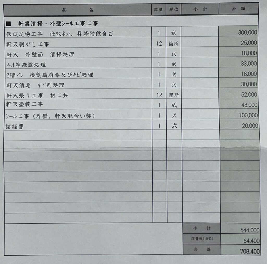 この記事では、私が実際に受け取った見積書の全内訳を公開します。